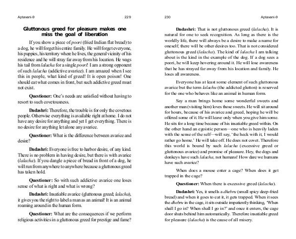 If you show a piece of poori( fried Indian flat bread) to a dog, he will forget his entire family. He will forget everyone, his puppies, his territory where he lives, the general vicinity of his residence and he will stray far away from his location. He wags his tail from lalacha for a single poori! I am a strong opponent of such lalacha( addictive avarice). I am amazed when I see this in people, what kind of greed! It is open poison! One should eat what comes in front, but such addictive greed must not exist.