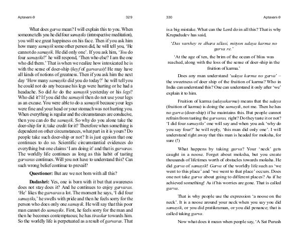 What does garva mean? I will explain this to you. When someone tells you he did four samayiks( introspective meditation), you will see great happiness on his face. Then if you ask him how many samayik some other person did, he will tell you,‘ He cannot do samayik. He did only one’. If you ask him,‘ You do four samayiks?’ he will respond,‘ Then who else? I am the one who did them.’ That is when we realize how intoxicated he is with the sense of doer-ship( keyf of garvaras)! He may have all kinds of notions of greatness. Then if you ask him the next day‘ How many samayiks did you do today?’ he will tell you he could not do any because his legs were hurting or he had a headache. So did he do the samayik yesterday or his legs? Who did it? If you did the samayik then do not use your legs as an excuse. You were able to do a samayik because your legs were fine and your head or your stomach was not hurting you. When everything is regular and the circumstances are conducive, then you can do the samayik. So why do you alone take the doer-ship for it; take credit for it? Therefore when something is dependent on other circumstances, what part in it is yours? Do people take such doer-ship or not? It is just egoism that one continues to do so. Scientific circumstantial evidences do everything but one claims‘ I am doing it’ and that is garvaras. The worldly life continues as long as this habit of tasting garvaras continues. Will you not have to understand this? Can such wrong belief continue to prevail?