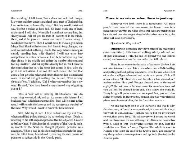 this wedding.’ I tell them,‘ No it does not look bad. People know me and they understand that I am a man of God and that I am not in tune with worldly things.’ But they would insist and say,‘ No but it makes us look bad.’ So then I made one of them understand, I told him,‘ Normally I would not say anything but since you ask I will tell you the truth. If I were to sit in the middle there, and if the jeweler Laxmichand were to come along, I would have to move. Then I would have to move again when Maganbhai Shankarbhai comes. So I have to keep changing my seat, so instead of suffering insults this way, what is wrong in simply standing here with dignity? I will not enter into competition in such a racecourse. I am better off standing here than sitting in the middle and taking the number nine seat and feeling insulted.’ I did not say this directly to him, but I came to the conclusion that only the horse that comes in first, wins the prize and not others. I do not like such races. The one that comes first gets the prize and others that run just as hard and come in second and get nothing. So, he said,‘ That is very shrewd of you.’ I told him,‘ Call it what you want but that is my way.’ He said,‘ You have found a very shrewd way of getting out of it.’