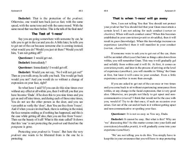 So what have I said? If you can do this nine times over without any effect at all within you, then I will tell you that you have become‘ Dada’. If he does this to you nine times and you get on and off nine times, and during each of those nine times, You do not see the other person as the doer, and you see vyavasthit as verily the‘ doer’, then You are free from‘ I-ness’. And if when you are invited back, there is nothing in the mind, the face remains smiling as if nothing has happened, and this is the case while getting off also, then you are free from‘ I-ness’. Then see the beauty of it all! What is this state called? It shows that this‘ one’ is not protecting the prakruti and therefore the potapanu is gone.
