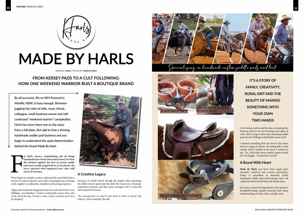 By all accounts, life on WH Pastoral in Manilla, NSW, is busy enough. Between juggling the roles of wife, mum, friend, colleague, small-business owner and selfconfessed“ weekend-warrior” campdrafter, Harls has never been one to shy away from a full plate. But add to that a thriving handmade saddle-pad business and you begin to understand the quiet determination behind the brand Made By Harls.