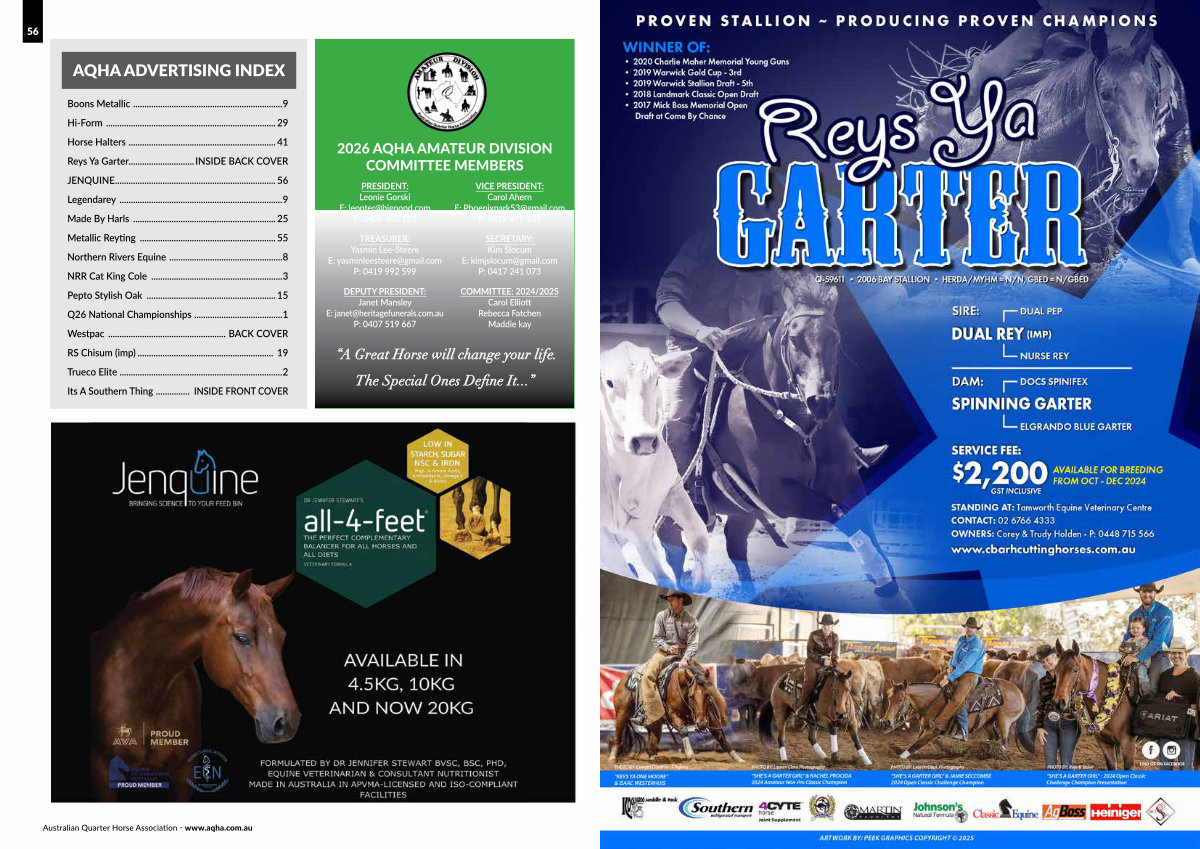 Boons Metallic................................................................... 9 Hi-Form............................................................................ 29 Horse Halters.................................................................. 41 Reys Ya Garter............................. INSIDE BACK COVER JENQUINE........................................................................ 56 Legendarey......................................................................... 9 Made By Harls................................................................ 25 Metallic Reyting............................................................. 55 Northern Rivers Equine................................................... 8 NRR Cat King Cole........................................................... 3 Pepto Stylish Oak.......................................................... 15 Q26 National Championships........................................ 1 Westpac..................................................... BACK COVER RS Chisum( imp)............................................................. 19 Trueco Elite........................................................................ 2 Its A Southern Thing................ INSIDE FRONT COVER