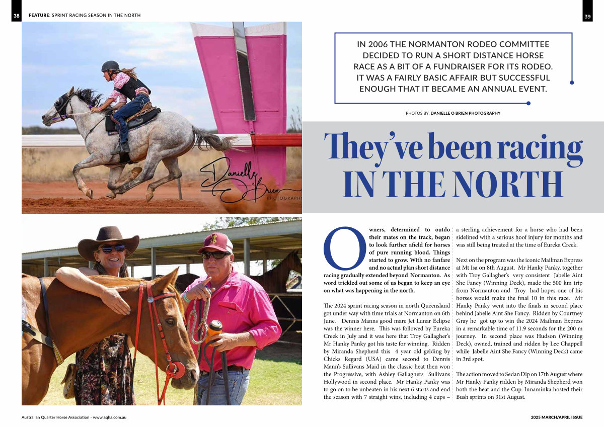 The 2024 sprint racing season in north Queensland got under way with time trials at Normanton on 6th June . Dennis Manns good mare Jet Lunar Eclipse was the winner here . This was followed by Eureka Creek in July and it was here that Troy Gallagher ’ s Mr Hanky Panky got his taste for winning . Ridden by Miranda Shepherd this 4 year old gelding by Chicks Regard ( USA ) came second to Dennis Mann ’ s Sullivans Maid in the classic heat then won the Progressive , with Ashley Gallaghers Sullivans Hollywood in second place . Mr Hanky Panky was to go on to be unbeaten in his next 6 starts and end the season with 7 straight wins , including 4 cups – a sterling achievement for a horse who had been sidelined with a serious hoof injury for months and was still being treated at the time of Eureka Creek .