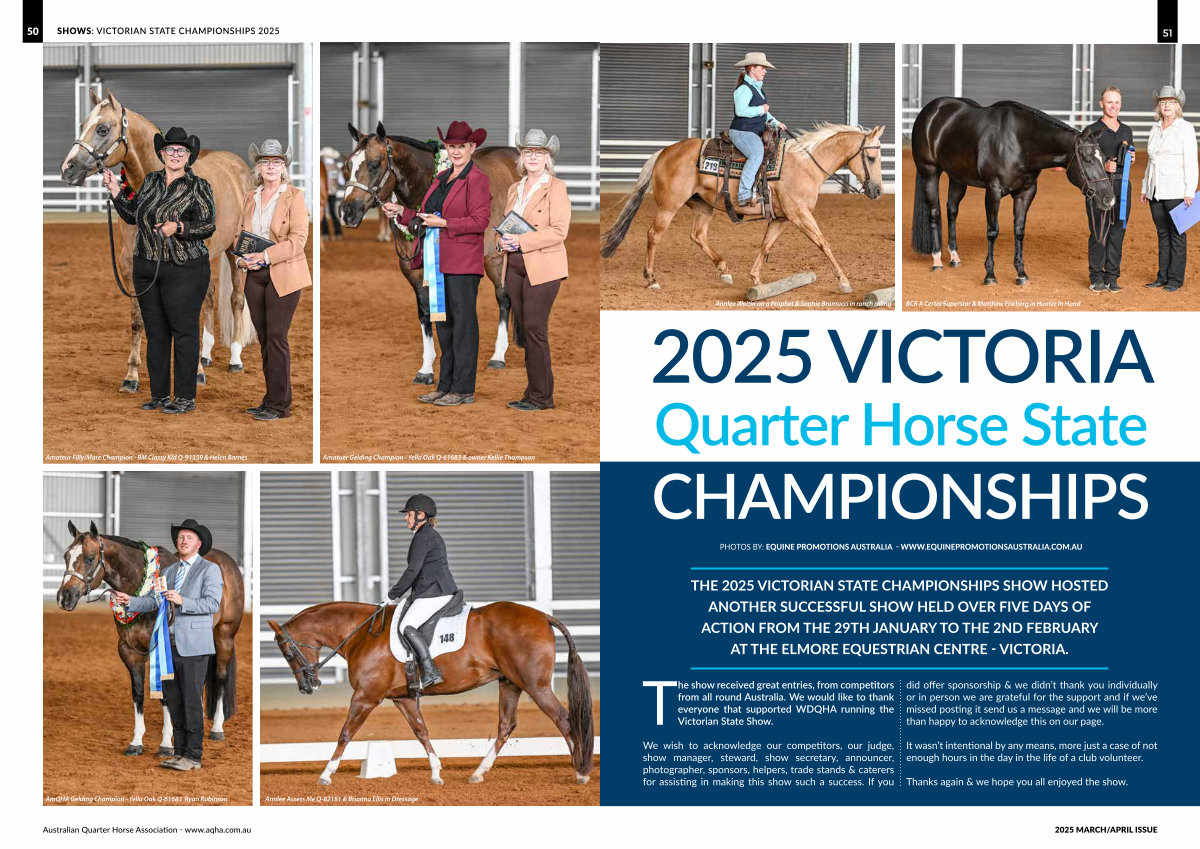 THE 2025 VICTORIAN STATE CHAMPIONSHIPS SHOW HOSTED ANOTHER SUCCESSFUL SHOW HELD OVER FIVE DAYS OF ACTION FROM THE 29TH JANUARY TO THE 2ND FEBRUARY AT THE ELMORE EQUESTRIAN CENTRE - VICTORIA .