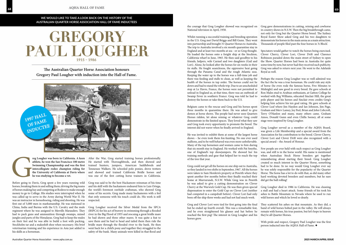 Few people are ever held with such respect as Greg Lougher was , and still is in the horse world . His name is mentioned when Australian Stock Horse breeders get together remembering about starting their breed . Greg Lougher created so much interest in the Quarter Horse , something had to be done . In no way would Greg Lougher ever say he was solely responsible for the popularity of the Quarter Horse . The horse has a lot to do with that , as did many other hard working devoted breeders and members , but he sure did get the ball rolling !