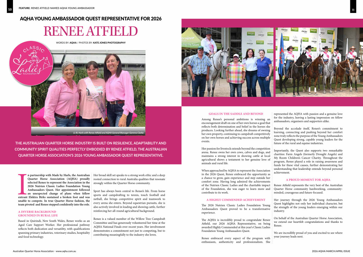 COMMUNITY SPIRIT QUALITIES PERFECTLY EMBODIED BY RENEE ATFIELD, THE AUSTRALIAN QUARTER HORSE ASSOCIATION’ S 2026 YOUNG AMBASSADOR QUEST REPRESENTATIVE.