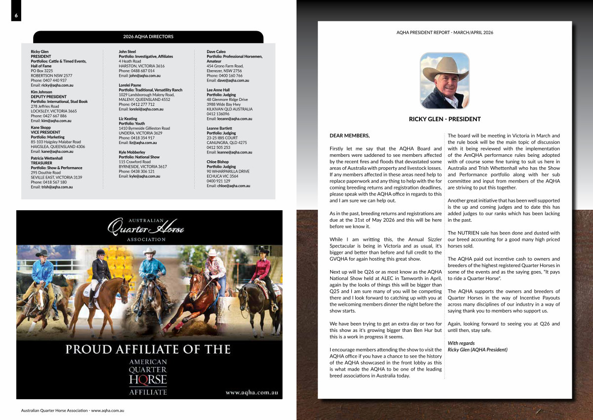 Firstly let me say that the AQHA Board and members were saddened to see members affected by the recent fires and floods that devastated some areas of Australia with property and livestock losses. If any members affected in these areas need help to replace paperwork and any thing to help with the for coming breeding returns and registration deadlines, please speak with the AQHA office in regards to this and I am sure we can help out.