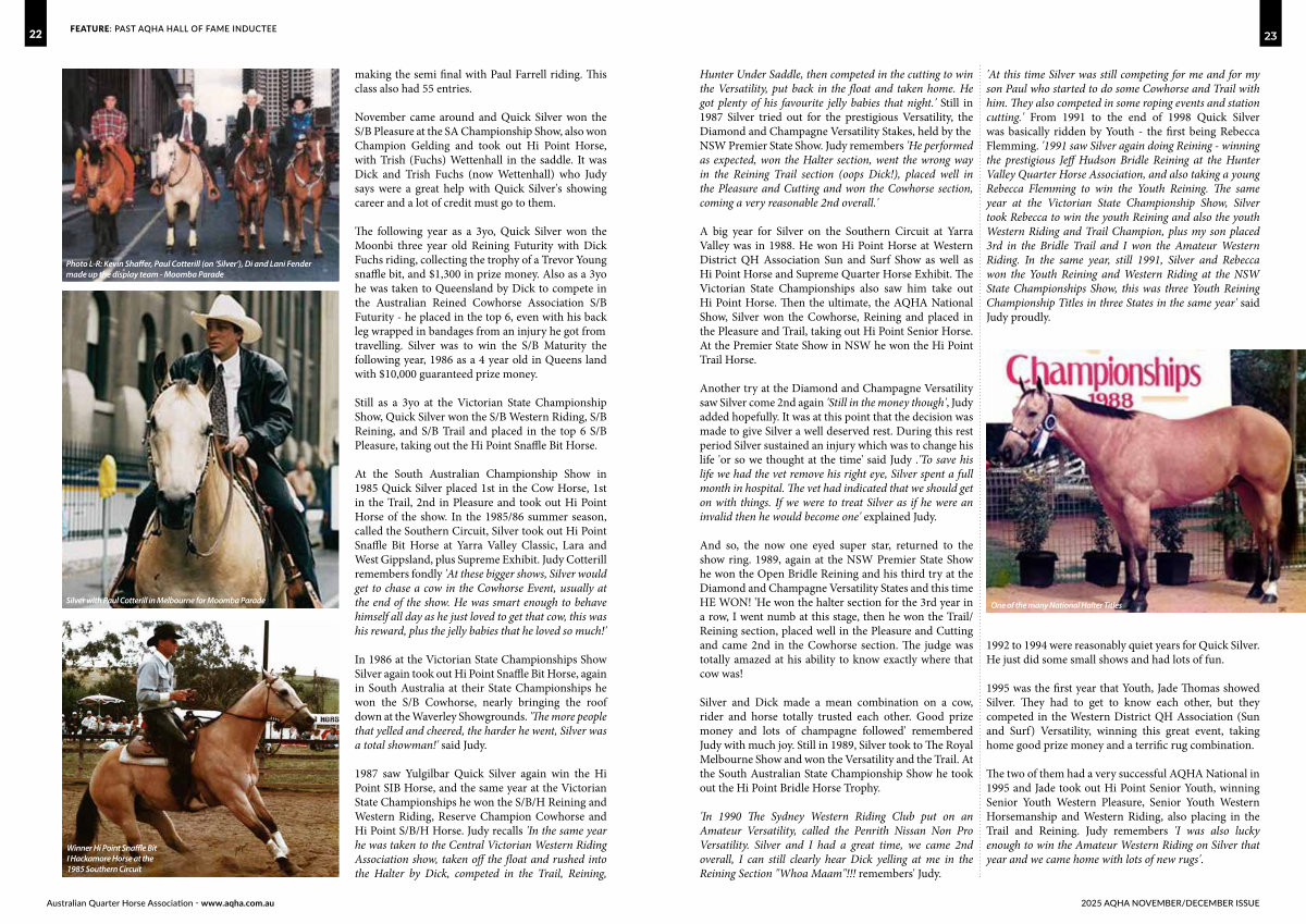 Silver and Dick made a mean combination on a cow, rider and horse totally trusted each other. Good prize money and lots of champagne followed ' remembered Judy with much joy. Still in 1989, Silver took to The Royal Melbourne Show and won the Versatility and the Trail. At the South Australian State Championship Show he took out the Hi Point Bridle Horse Trophy.
