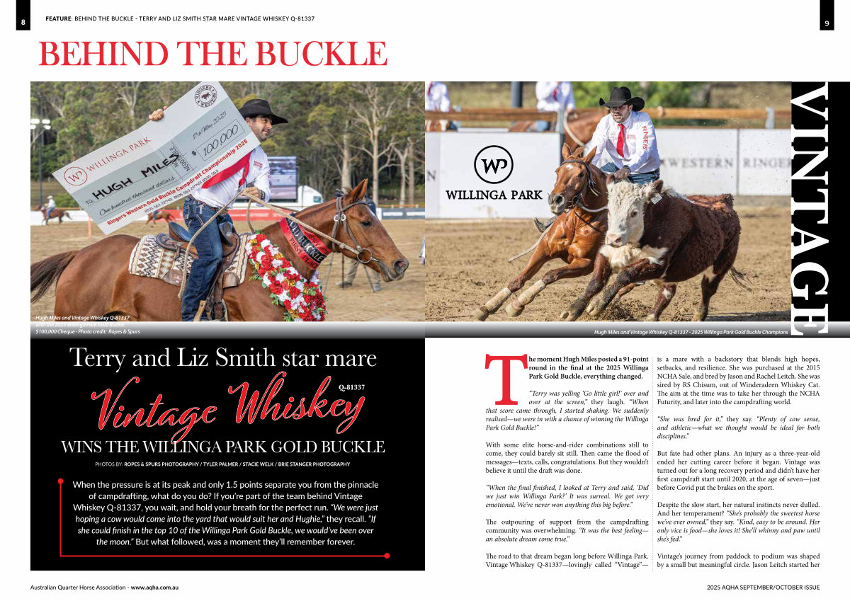 When the pressure is at its peak and only 1.5 points separate you from the pinnacle of campdrafting, what do you do? If you’ re part of the team behind Vintage Whiskey Q-81337, you wait, and hold your breath for the perfect run.“ We were just hoping a cow would come into the yard that would suit her and Hughie,” they recall.“ If she could finish in the top 10 of the Willinga Park Gold Buckle, we would’ ve been over the moon.” But what followed, was a moment they’ ll remember forever.