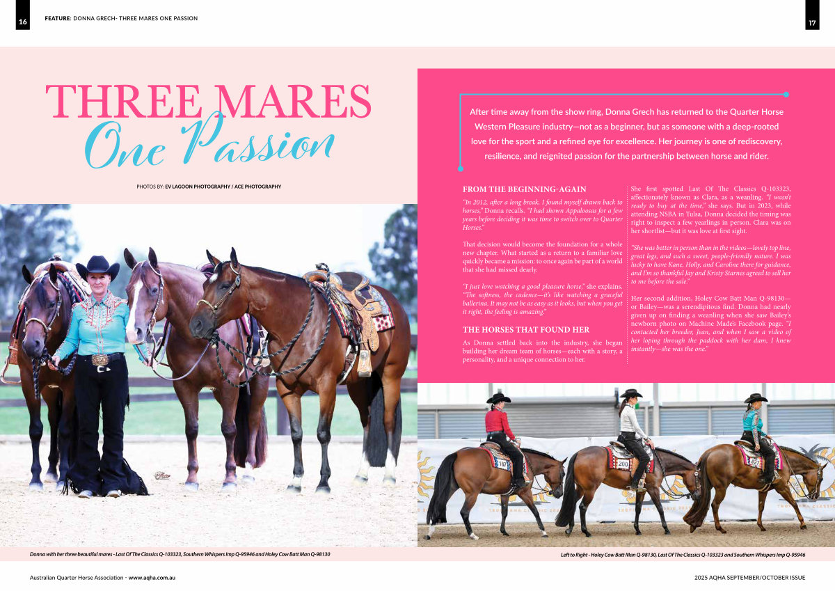 After time away from the show ring, Donna Grech has returned to the Quarter Horse Western Pleasure industry— not as a beginner, but as someone with a deep-rooted love for the sport and a refined eye for excellence. Her journey is one of rediscovery, resilience, and reignited passion for the partnership between horse and rider.