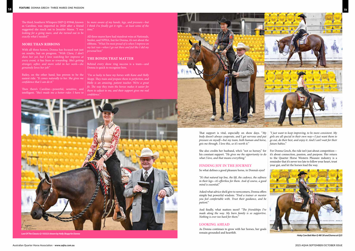 All three mares have had standout wins at Nationals, Sizzler, and NPHA, but for Donna, it’ s not about the ribbons.“ What I’ m most proud of is when I improve on my last run— when I go out there and feel like I did my personal best.”