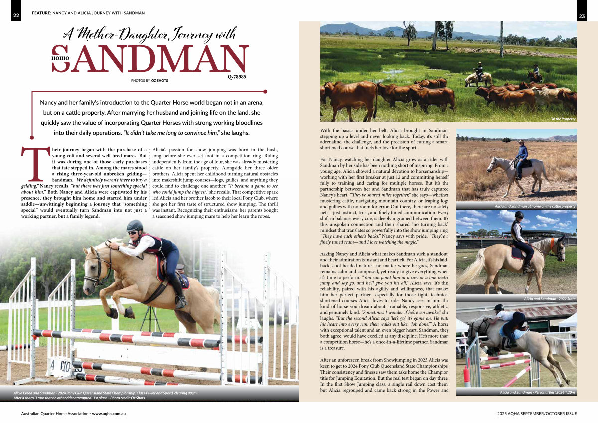 Their journey began with the purchase of a young colt and several well-bred mares. But it was during one of those early purchases that fate stepped in. Among the mares stood a rising three-year-old unbroken gelding— Sandman.“ We definitely weren’ t there to buy a gelding,” Nancy recalls,“ but there was just something special about him.” Both Nancy and Alicia were captivated by his presence, they brought him home and started him under saddle— unwittingly beginning a journey that“ something special” would eventually turn Sandman into not just a working partner, but a family legend.