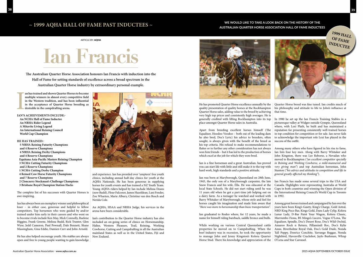 The Australian Quarter Horse Association honours Ian Francis with induction into the Hall of Fame for setting standards of excellence across a broad spectrum in the Australian Quarter Horse industry by extraordinary personal example.