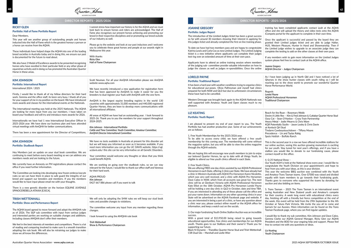 I would like to thank my sub committee, Kim Johnson and Dave Caleo, Gemma Clarke our AQHA General Manager, Ricky Glen our AQHA President and the BOD for your ongoing help and support. Please feel free to contact me with any questions or ideas.
