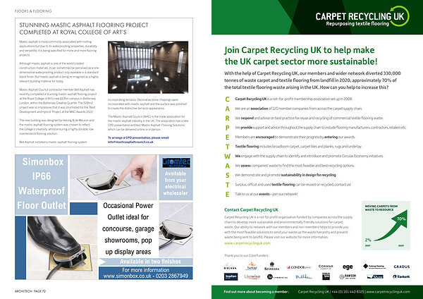 Carpet Recycling UK is a not-for-profit membership association set up in 2008 . We are an association of 120 member companies from across the carpet supply chain . We respond and advise on best practice for reuse and recycling of commercial textile flooring waste . We provide support and advice throughout the supply chain to include flooring manufacturers , contractors , retailers etc . Members are encouraged to demonstrate their progress by entering our awards . Textile flooring includes broadloom carpet , carpet tiles and planks , rugs and underlay . We engage with the supply chain to identify and introduce and promote Circular Economy initiatives We assess companies ’ waste to find the most feasible and best recycling options . We demonstrate and promote sustainability in design for recycling . Surplus , offcut and used textile flooring can be reused or recycled , contact us ! Talk to us at our events – join our network !