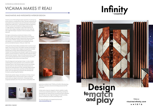 Vicaima , as one of the leading European exponents of contemporary joinery solutions , including interiors doors , doorsets , wall panels and associated furniture products , have just introduced a new brand for professionals called Infinity . Combining their extensive experience within this sector with the latest technological advancements in image realisation , they present a major step forward for the world of interior design , enabling creative vision to be made real , with imaginative design composition that encompasses multiple elements .