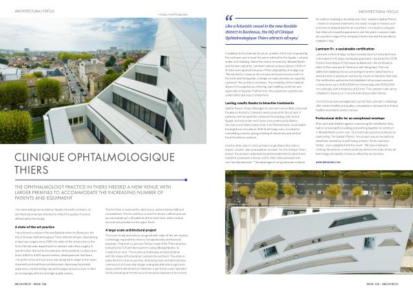 Like a futuristic vessel in the new Bastide district in Bordeaux , the HQ of Clinique Ophtalmologique Thiers attracts all eyes / for outdoor cladding is durability over time ”, explains Gaëtan Plessis . “ Thanks to bioactive treatments , the onset of organic mosses such as lichens is delayed and the air is purified . This results in a façade that retains its beautiful appearance over the years . Laminam slabs are a perfect image of the company ’ s know-how and the excellence of Made in Italy .”