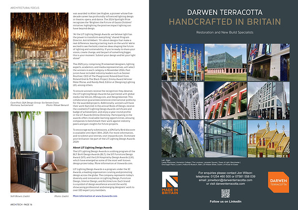 To encourage early submissions, a 10 % Early Bird discount is available until April 30th, 2025. For more information, and to submit your entries, visit litawards. com. Illuminate your brilliance— be part of the LIT Lighting Design Awards 2025!