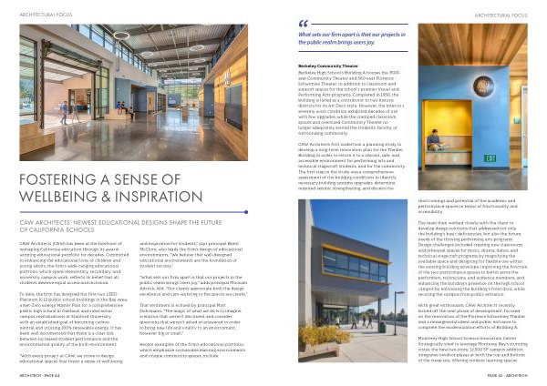 CAW Architects( CAW) has been at the forefront of reshaping California education through its awardwinning educational portfolio for decades. Committed to enhancing the educational lives of children and young adults, the firm’ s wide-ranging educational portfolio, which spans elementary, secondary, and university campus work, reflects its belief that all students deserve equal access and inclusion.