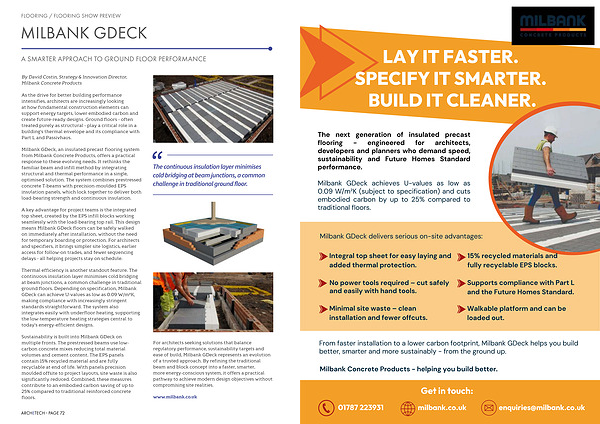 For architects seeking solutions that balance regulatory performance, sustainability targets and ease of build, Milbank GDeck represents an evolution of a trusted approach. By refining the traditional beam and block concept into a faster, smarter, more energy-conscious system, it offers a practical pathway to achieve modern design objectives without compromising site realities.