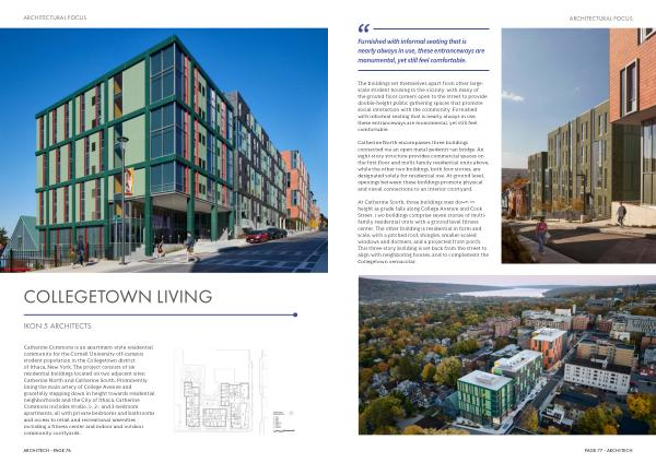 Catherine Commons is an apartment-style residential community for the Cornell University off-campus student population in the Collegetown district of Ithaca, New York. The project consists of six residential buildings located on two adjacent sites: Catherine North and Catherine South. Prominently lining the main artery of College Avenue and gracefully stepping down in height towards residential neighborhoods and the City of Ithaca, Catherine Commons includes studio, 1-, 2-, and 3-bedroom apartments, all with private bedrooms and bathrooms and access to retail and recreational amenities including a fitness center and indoor and outdoor community courtyards.