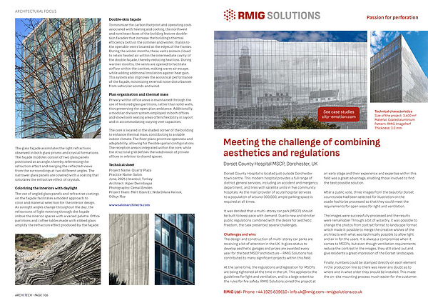 Technical characteristics Size of the project: 3,400 m2 Material: Coated aluminium Pattern: RMIG ImagePerf Thickness: 3.0 mm