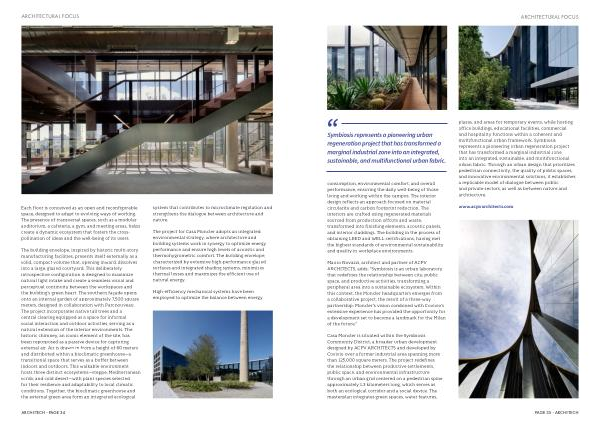 consumption, environmental comfort, and overall performance, ensuring the daily well-being of those living and working within the campus. The interior design reflects an approach focused on material circularity and carbon footprint reduction. The interiors are crafted using regenerated materials sourced from production offcuts and waste, transformed into finishing elements, acoustic panels, and interior claddings. The building in the process of obtaining LEED and WELL certifications, having met the highest standards of environmental sustainability and quality in workplace environments. plazas, and areas for temporary events, while hosting office buildings, educational facilities, commercial and hospitality functions within a coherent and multifunctional urban framework. Symbiosis represents a pioneering urban regeneration project that has transformed a marginal industrial zone into an integrated, sustainable, and multifunctional urban fabric. Through an urban design that prioritizes pedestrian connectivity, the quality of public spaces, and innovative environmental solutions, it establishes a replicable model of dialogue between public and private sectors, as well as between nature and architecture.