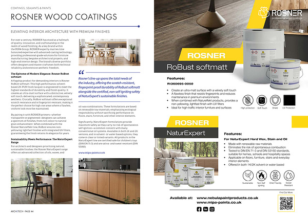 Rosner’ s line-up spans the total needs of the industry, offering the scratch-resistant, fingerprint-proof durability of RoBust softmatt alongside the certified, non-self-igniting safety of NaturExpert’ s sustainable finishes.
