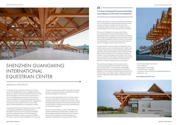 Guangming International Equestrian Center, located in Guangming Subdistrict, Guangming District, Shenzhen, serves as the main venue for dressage and show jumping events of the 15th National Games. The project occupies a site area of 50,018 m ², with a total floor area of 44,600 m ². Its functions include the main arena, indoor and outdoor training grounds, competition facilities, and equine housing, accommodating up to 120 horses.