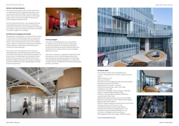 Technical sheet Project Name: Aimer Suzhou Headquarters Location: Wujiang District, Suzhou, Jiangsu Province, China Client: Aimer Co., Ltd. Site Area: 11,330 m2 Architecture area: 41,062 sqm( Above Ground: 28,529 sqm, Below Ground: 12,533 sqm) Design period: Jun. 2019- Jun. 2022 Construction period: Mar. 2019- Dec. 2024 Completion: Jan. 2025 Architecture Redesign, Interior Design, Landscape Design: Crossboundaries, Beijing, China Partners in charge: Binke Lenhardt, DONG Hao Lead Architect: GAO Yang Design team: Marijana Simic, Silvia Campi, HUANG Biao, Ivan Chen, Sean Yu, HOU Jinghui, Elena Gamez Miguelez, Erik Chen, GAN Li Earlier schematic design( unrealized) and construction drawing revision: Arts Group Co., Ltd. Collaborative Design Team: Beijing Weisitu Architectural Decoration Engineering Co., Ltd., Shanghai Tianjing Landscape Design Co., Ltd. Contractor: Wujiang Construction Group Photographers: Shan-jian images, YANG Chaoying