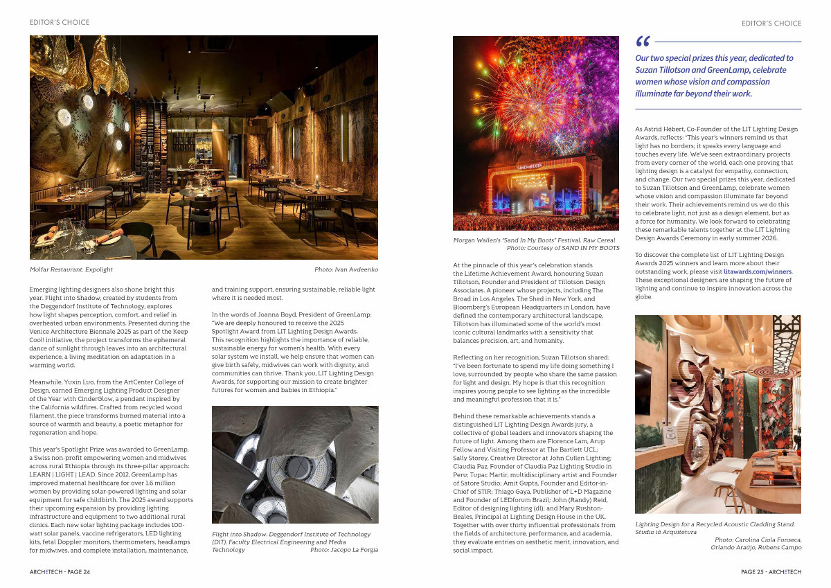 As Astrid Hébert, Co-Founder of the LIT Lighting Design Awards, reflects:“ This year’ s winners remind us that light has no borders; it speaks every language and touches every life. We’ ve seen extraordinary projects from every corner of the world, each one proving that lighting design is a catalyst for empathy, connection, and change. Our two special prizes this year, dedicated to Suzan Tillotson and GreenLamp, celebrate women whose vision and compassion illuminate far beyond their work. Their achievements remind us we do this to celebrate light, not just as a design element, but as a force for humanity. We look forward to celebrating these remarkable talents together at the LIT Lighting Design Awards Ceremony in early summer 2026.
