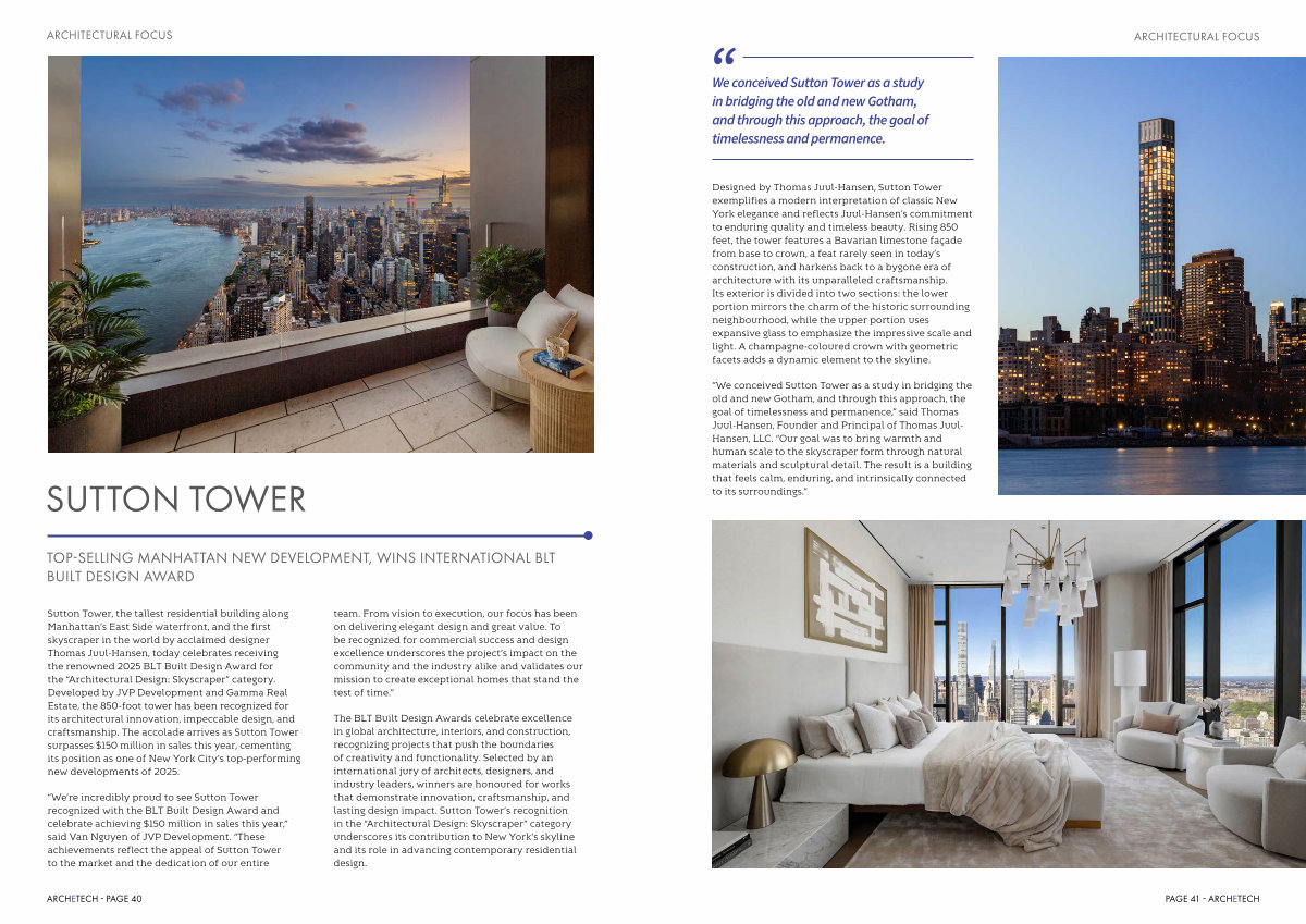 Sutton Tower, the tallest residential building along Manhattan’ s East Side waterfront, and the first skyscraper in the world by acclaimed designer Thomas Juul-Hansen, today celebrates receiving the renowned 2025 BLT Built Design Award for the“ Architectural Design: Skyscraper” category. Developed by JVP Development and Gamma Real Estate, the 850-foot tower has been recognized for its architectural innovation, impeccable design, and craftsmanship. The accolade arrives as Sutton Tower surpasses $ 150 million in sales this year, cementing its position as one of New York City’ s top-performing new developments of 2025.