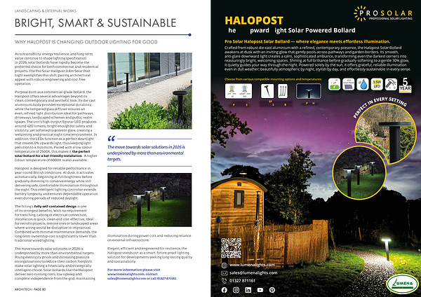 The move towards solar solutions in 2026 is underpinned by more than environmental targets. Rising electricity prices and increasing pressure on organisations to reduce their carbon footprint make solar lighting a financially and strategically intelligent choice. Solar bollards like the Halopost deliver zero running costs, low upkeep and complete independence from the grid, maintaining illumination during power cuts and reducing reliance on external infrastructure.