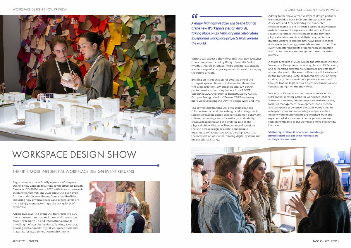 Registration is now officially open for Workspace Design Show London, returning to the Business Design Centre on 25 – 26 February 2026 with its most forwardthinking edition yet. The 2026 show will push even further under its new theme, Connected Realities, exploring how physical spaces and digital layers are increasingly merging to shape the workplaces of tomorrow.