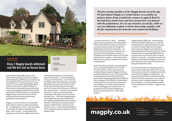 The fire-resistant qualities of the Magply boards saved the day. We had utilised Magply as a render-backer on a number of projects before being awarded the contract to apply K-Rend to the half dozen homes here and have always been very pleased with the performance. It is an easy board to cut and fix, while we can now definitely confirm to clients that it fully complies with the fire requirements for domestic and commercial buildings.