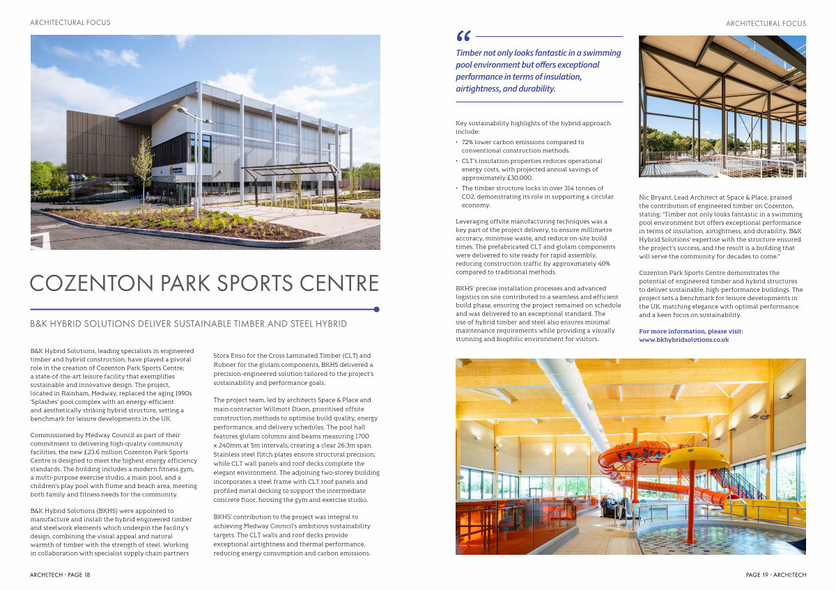 B & K Hybrid Solutions, leading specialists in engineered timber and hybrid construction, have played a pivotal role in the creation of Cozenton Park Sports Centre; a state-of-the-art leisure facility that exemplifies sustainable and innovative design. The project, located in Rainham, Medway, replaced the aging 1990s‘ Splashes’ pool complex with an energy-efficient and aesthetically striking hybrid structure, setting a benchmark for leisure developments in the UK.