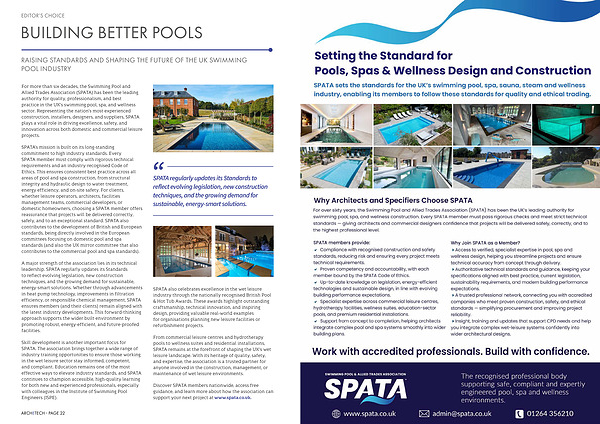 A major strength of the association lies in its technical leadership. SPATA regularly updates its Standards to reflect evolving legislation, new construction techniques, and the growing demand for sustainable, energy-smart solutions. Whether through advancements in heat pump technology, improvements in filtration efficiency, or responsible chemical management, SPATA ensures members( and their clients) remain aligned with the latest industry developments. This forward-thinking approach supports the wider built environment by promoting robust, energy-efficient, and future-proofed facilities.