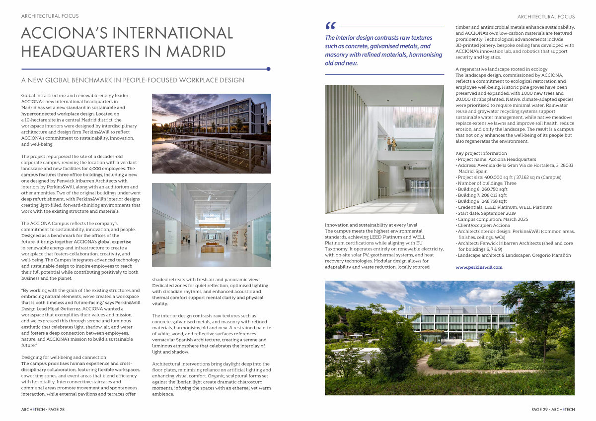 Innovation and sustainability at every level The campus meets the highest environmental standards, achieving LEED Platinum and WELL Platinum certifications while aligning with EU Taxonomy. It operates entirely on renewable electricity, with on-site solar PV, geothermal systems, and heat recovery technologies. Modular design allows for adaptability and waste reduction, locally sourced timber and antimicrobial metals enhance sustainability, and ACCIONA’ s own low-carbon materials are featured prominently. Technological advancements include 3D-printed joinery, bespoke ceiling fans developed with ACCIONA’ s innovation lab, and robotics that support security and logistics.