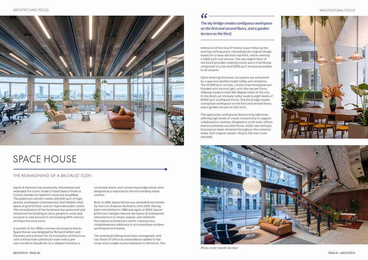 Squire & Partners has sensitively refurbished and extended the iconic Grade II-listed Space House in Covent Garden for Seaforth Land and QuadReal. The ambitious retrofit creates 255,000 sq ft of highquality workspace, contemporary and flexible retail space at ground floor, and an improved public realm. The revitalisation of the landmark has preserved and enhanced the building to allow people to work and socialise in and around its outstanding 20th century architecture once more.