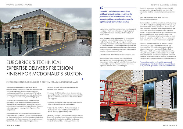 Eurobrick Systems recently supplied its X-Clad cladding system together with specially sourced stone slips for a new McDonald’ s restaurant in Buxton, working closely with long-term client A. E. P.( Modular Construction) Limited to achieve a high-quality finish on a complex and technically demanding project.