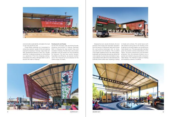 Designed by Leon Jacobs Architects , the look and feel of the single level mall takes inspiration from the theme of a Bushveld Oasis and echoes the surrounding landscape with its trees , succulents and rock formations . This is evident in the organic patterns found in the ceiling design , bulkheads and branding elements as well as the colour palette of sunset reds and shades of grey . Large artificial trees within the mall emphasise the bushveld theme whilst also imparting a feeling