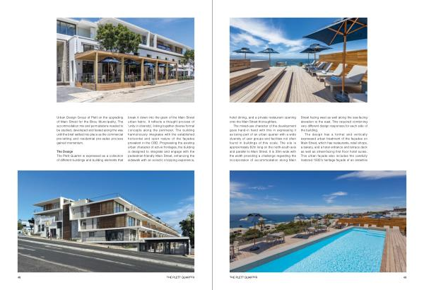 The Design The Plett Quarter is expressed as a collection of different buildings and building elements that break it down into the grain of the Main Street urban fabric . It reflects a thought process of ‘ unity in diversity ’, linking together diverse formal concepts along the perimeter . The building harmoniously integrates with the established horizontal and open nature of the façades prevalent in the CBD . Progressing the existing urban character of active frontages , the building is designed to integrate and engage with the pedestrian-friendly Main Street , enhancing the sidewalk with an eclectic shopping experience ,