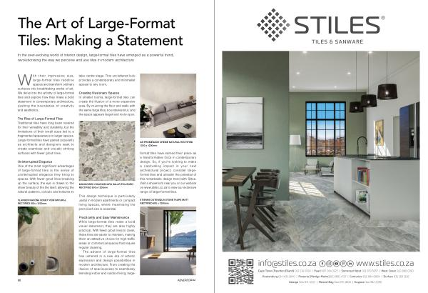 The advent of large-format tiles has ushered in a new era of artistic expression and design possibilities in modern architecture . From creating the illusion of spaciousness to seamlessly blending indoor and outdoor living , largeformat tiles have earned their place as a transformative force in contemporary design . So , if you ’ re looking to make a captivating impact in your next architectural project , consider largeformat tiles and unleash the potential of this remarkable design trend with Stiles . Visit a showroom near you or our website on www . stiles . co . za to view our extensive range of large-format tiles .