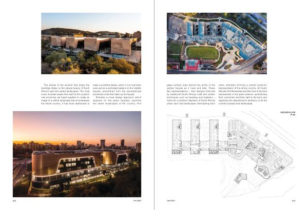 The design of the artwork that wraps the buildings draws on the natural beauty of South Africa ’ s vast and varied landscapes . The most iconic mountain peaks from each of the country ’ s nine provinces are fused together to create an image of a unified landscape that encompasses the whole country . It has been abstracted to make a pointillist design , which in turn has been executed as a perforated pattern on the metallic façade , assembled from the painstakingly positioned units that make up the façade .