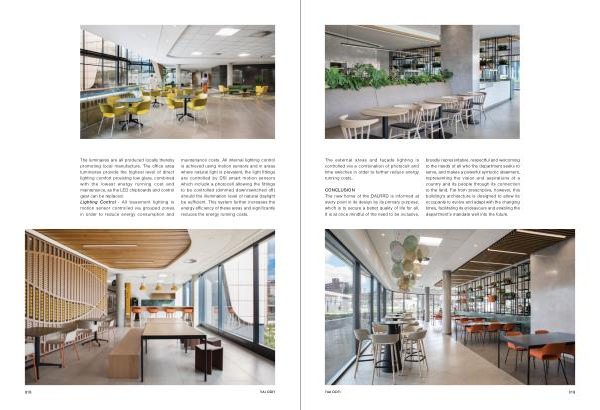 The luminaires are all produced locally thereby promoting local manufacture . The office area luminaires provide the highest level of direct lighting comfort providing low glare , combined with the lowest energy running cost and maintenance , as the LED chipboards and control gear can be replaced . Lighting Control - All basement lighting is motion sensor controlled via grouped zones in order to reduce energy consumption and