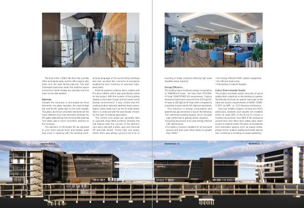 Only low Volatile Organic Compound ( VOC ) adhesives , sealants and carpets are installed within at least 95 % of the fit-out to ensure a healthy environment . Over 80 % of the measured ground floor and office floor plates have direct access to external views . Provision of recreational and restorative spaces such as pause areas , prayer rooms , outdoor seating and break spaces also contribute to building occupant wellbeing .