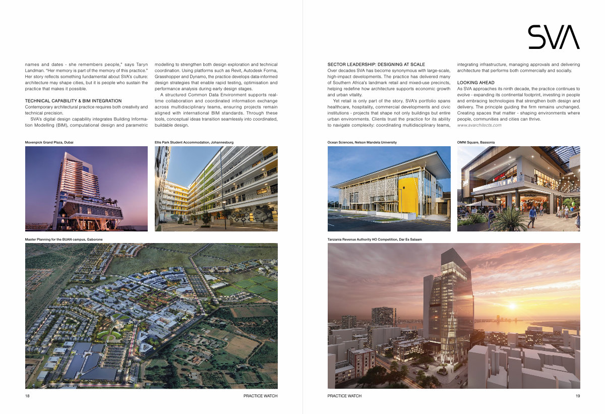 SECTOR LEADERSHIP: DESIGNING AT SCALE Over decades SVA has become synonymous with large-scale, high-impact developments. The practice has delivered many of Southern Africa’ s landmark retail and mixed-use precincts, helping redefine how architecture supports economic growth and urban vitality.