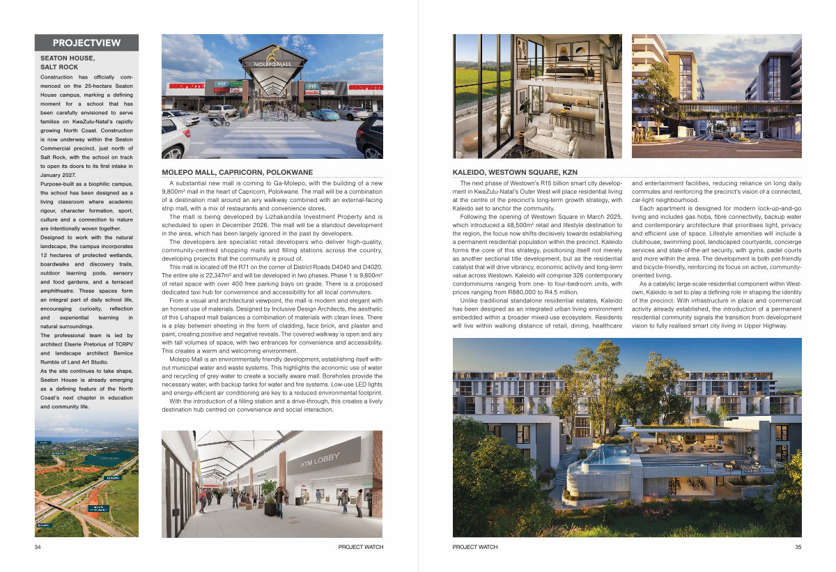 Following the opening of Westown Square in March 2025, which introduced a 48,500m 2 retail and lifestyle destination to the region, the focus now shifts decisively towards establishing a permanent residential population within the precinct. Kaleido forms the core of this strategy, positioning itself not merely as another sectional title development, but as the residential catalyst that will drive vibrancy, economic activity and long-term value across Westown. Kaleido will comprise 326 contemporary condominiums ranging from one- to four-bedroom units, with prices ranging from R880,000 to R4.5 million.