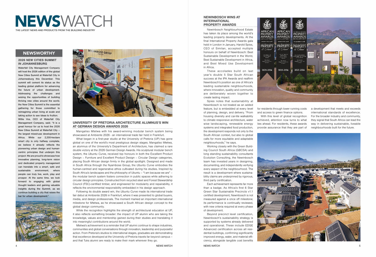 What began in a first-year studio at the University of Pretoria( UP) has gone global on one of the world’ s most prestigious design stages. Mangaliso Mtetwa, an alumnus of the University’ s Department of Architecture, has claimed a rare double victory at the 2026 German Design Awards. His sculptural modular bench system, the Ubuntu Curve, received top honours in both the Excellent Product Design – Furniture and Excellent Product Design – Circular Design categories, placing South African design firmly in the global spotlight. Designed and made in South Africa through the Nyambose Group, the Ubuntu Curve embodies the human-centred and regenerative ethos cultivated during his studies. Inspired by South Africa’ s landscapes and the philosophy of Ubuntu –“ I am because we are” – the modular bench system fosters connection in public spaces while adhering to circular design principles. Constructed from recycled steel and Forest Stewardship Council( FSC)-certified timber, and engineered for modularity and repairability, it reflects the environmental responsibility embedded in his design approach.