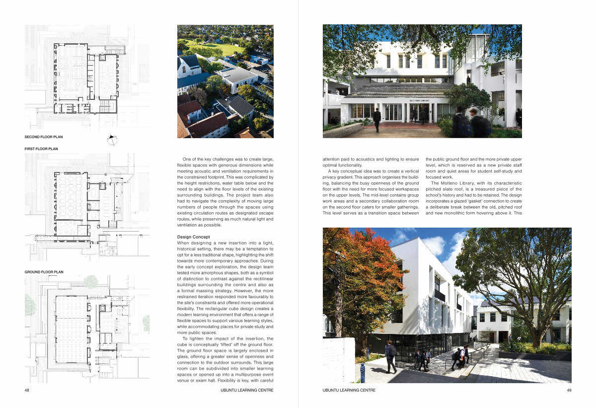 The Molteno Library, with its characteristic pitched slate roof, is a treasured piece of the school’ s history and had to be retained. The design incorporates a glazed‘ gasket’ connection to create a deliberate break between the old, pitched roof and new monolithic form hovering above it. This